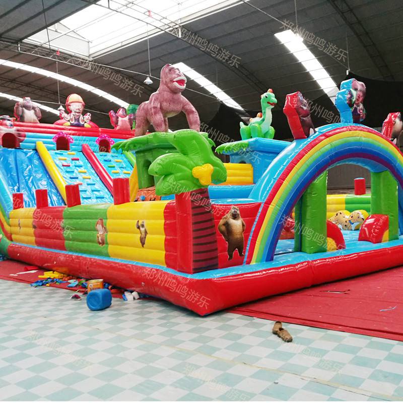 产品详情:充气城堡使用专业的原料供应商,0.45mm一流的加厚,环保PVC材质。专业设计师的生产过程:切割,缝纫(热封),胶粘(美化),制品。尽量地缝制,针迹均匀,针迹尺寸在4.2和4.5mm之间(这样可以最大程度地缩减漏气并增加缝制部分的废料强度)粘毛刷的宽度与毛刷宽度之间的误差胶条不超过正负0.5cm。半圆形构造用以连接形状和大表面的极限,目的是使产品受力均匀,延长产品使用寿命。每两个形状之间以及形状与护栏之间有一定的安全间距。(1米)该产品形状栩栩如生,色调美丽,可以充分确保选手的安全。设备:1.切断电源,开启风扇接口和排风口,排风时间一般为10-25分钟,剩余空气须要挤压。如果设备因雨水淋湿,请不能不排干用水晾干。2.为了干净,请采用清洁剂擦去污渍和油渍,然后用水擦洗并干燥。3。折叠设备,用底面遮盖正面,然后盖上防水布4。如果长时间不用到,请折叠,捆扎和包装清洁的设备。存储温度一般而言在-50至40摄氏度之间5。风扇应防潮和防腐蚀。充气设备应留意以防啮齿动物和昆虫进入。